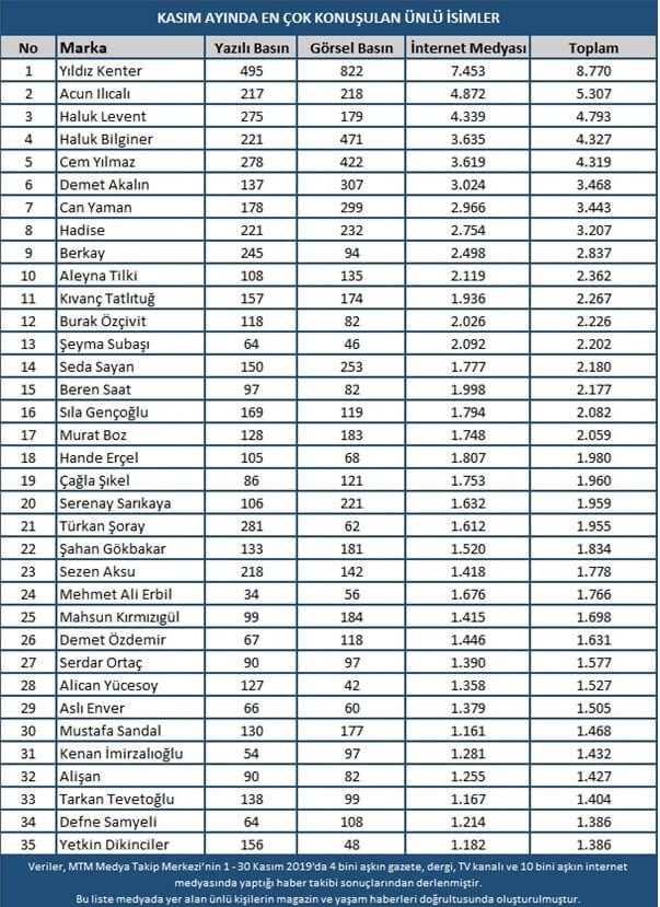 Kasım ayı içerisinde halkımız tarafından en çok konuşulan magazin ve sanat dünyasının ünlü isimleri belirlendi. Medya Takip Merkezi’nin (MTM), Magazin Gazetecileri Derneği için her ay düzenli olarak hazırladığı raporun detayları…