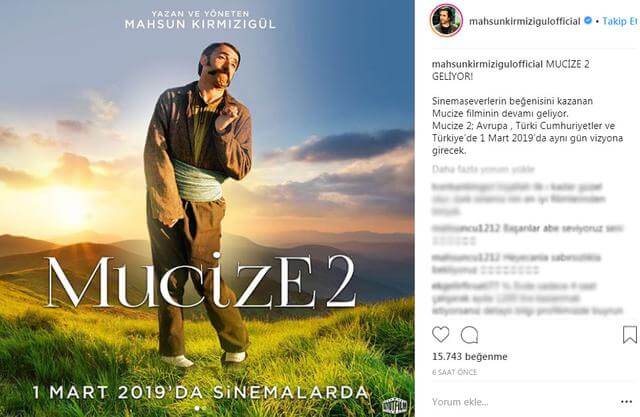 Son yıllarda yönetmenliğini ve senaryosunu yaptığı sinema filmleriyle gündeme gelen şarkıcı Mahsun Kırmızıgül, en son vizyona giren sinema filmi ‘Vezir Parmağı’ ile gişe hasılatında büyük zarara uğramıştı. Uzun aradan sonra Mahsun Kırmızıgül yeniden filmi ile beyaz perde de olacak. Ünlü Sanatçı Mahsun Kırmızıgül sosyal medya paylaşımında, ”Sinemaseverlerin beğenisini kazanan Mucize filminin devamı geliyor. Mucize 2; Avrupa , Türki Cumhuriyetler ve Türkiye’de 1 Mart 2019’da aynı gün vizyona girecek.” diyerek hayranlarına müjdeyi verdi…