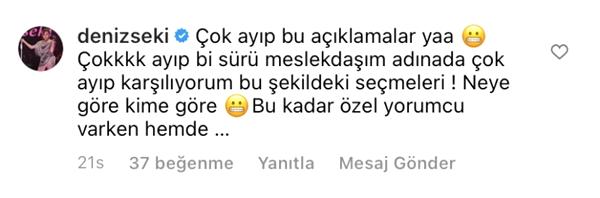 Bir araştırma şirketi, 2021’in En İyi Şarkıcıları olarak Melek Mosso, Sezen Aksu, Hadise ve Zeynep Bastık’ı seçti. Deniz Seki ise bu duruma “Bir sürü meslektaşım adına da çok ayıp karşılıyorum bu listeyi. Neye göre, kime göre? Bu kadar özel yorumcu varken hem de!” sözleriyle sosyal medya hesabından tepki gösterdi.