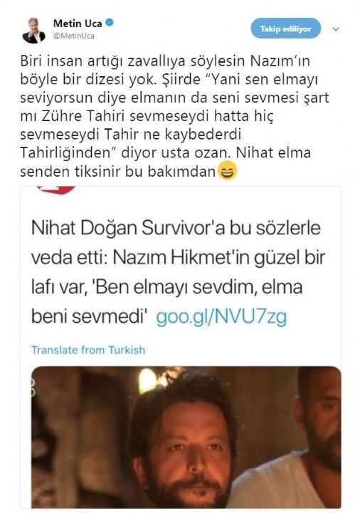 Konuşmasında Nazım Hikmet’in dizleri olduğunu söylediği sözler sarf eden Nihat Doğan’, Metin Uca’dan sert çıkış geldi. Metin Uca, Nihat Doğan için sosyal medya hesabından bir paylaşım yaparak “Biri insan artığı zavallıya söylesin Nazım’ın böyle bir dizesi yok” diyen Metin Uca, “Şiirde ‘Yani sen elmayı seviyorsun diye elmanın da seni sevmesi şart mı? Zühre Tahiri sevmeseydi hatta hiç sevmeseydi Tahir ne kaybederdi Tahirliğinden’ diyor usta ozan. Nihat elma senden tiksinir bu bakımdan.” diye yazdı.