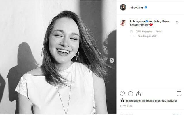 Instagram hesabı üzerinden gülerken fotoğraf paylaşımında bulunan Miray Daner, sevgilisi Kubilay Aka ise yorumda şu sözleri yazdı “Sen öyle gülersen hoş gelir bahar ❤️” .