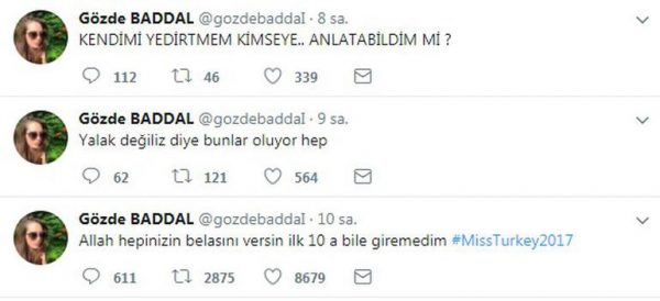 Yarışmada dereceye giremeyen Gözde Baddal’ ın adıyla açılan hesaptan yapılan, “Allah hepinizin belasını versin ilk 10′ a bile giremedim #MissTurkey2017” paylaşımı kısa sürede sosyal medyada en çok paylaşılan tweet’ ler arasına girdi. Paylaşımın medyada da geniş yer bulmasının ardından bir açıklama yapan Gözde Baddal, söz konusu hesabın kendisine ait olmadığını belirtti.