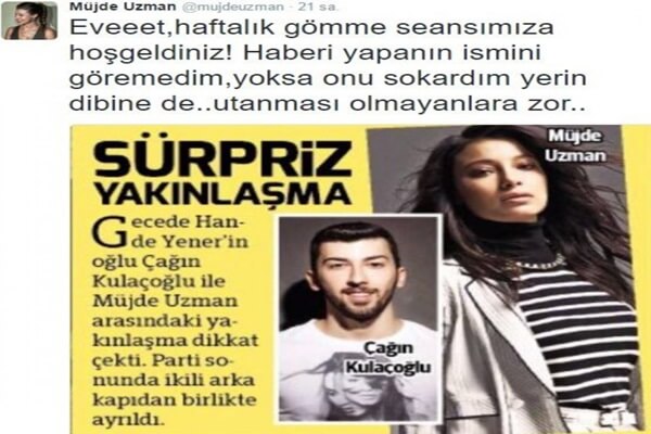 Aşk iddiaları karşısında çok öfkelenen Müjde Uzman, sosyal medya hesabı üzerinden iddiaları kesin bir dille yalanladı. Uzman, haberleri yapanlara “Evet, haftalık gömme seansımıza hoş geldiniz! Haberi yapanın ismini göremedim, yoksa onu sokardım yerin dibine de… Utanması olmayanlara zor.” diye ateş püskürdü.
