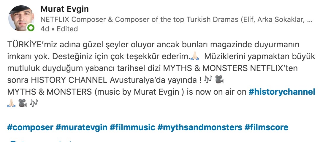 Usta sanatçı Erol Evgin’in kendisi gibi müzisyen olan oğlu Murat Evgin, her geçen gün başarısına başarı eklemeye devam ediyor. Murat Evgin’in müziklerini yaptığı, Netflix Amerika’da yayınlanan dizisi “Myths & Monsters” Avustralya’da da yayınlanmaya başladı.