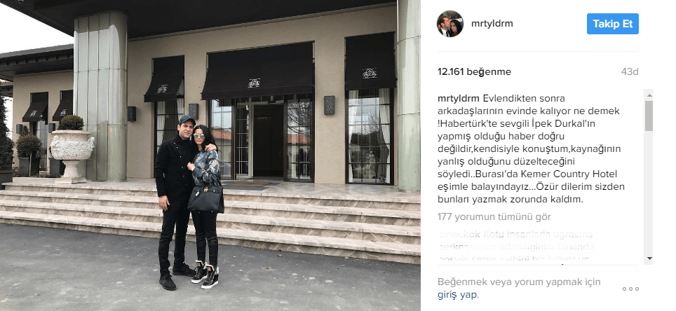 Evlendikten sonra arkadaşlarının evinde kalıyor ne demek !Habertürk’te sevgili İpek Durkal’ın yapmış olduğu haber doğru değildir,kendisiyle konuştum,kaynağının yanlış olduğunu düzelteceğini söyledi..Burası’da Kemer Country Hotel eşimle balayındayız…Özür dilerim sizden bunları yazmak zorunda kaldım.
