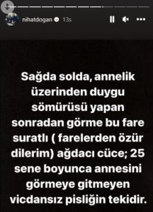 “Sağda solda annelik üzerinden duygu sömürüsü yapan sonradan görme bu fare suratlı ağdacı cüce, 25 sene boyunca annesini görmeye gitmeyen, vicdansız pisliğin tekidir. Allah şahit olsun ki çocuğumun rızkı olan o parayı senden alacağım. Ya da seni tüm Türkiye’ye rezil edip paramı öyle alacağım. En yakın zamanda çıkacağım televizyon programında bu fare suratlı tokatçı, ağdacı cücenin beni ve insanları nasıl dolandırdığını en ince ayrıntısına kadar anlatacak, bu tokatçıyı tüm Türkiye’ye rezil edeceğim.”…