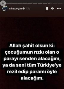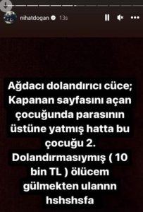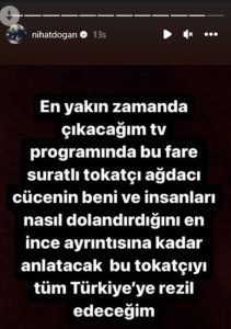 Paylaşımlarında, “Fare suratlı ağdacı cüce” sözleriyle anlatan Nihat Doğan, şu ifadelere yer verdi: “Şatafatlı açılışlarla sizleri hipnotize edip cebinizdeki parayı almaya çalışan sözde ağdacı, özde dolandırıcıların oyununa gelmeyin. Bu dini para olan fare suratlı ağdacı cüce, sadece bana değil, ifşa sayfalarına da borç takmış, kaçmış. Ağdacı dolandırıcı cüce, kapanan sayfasını açan çocuğun da parasının üstüne yatmış. Hatta bu çocuğu 2. dolandırmasıymış. (10 bin TL)”