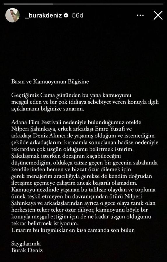 Yaşananların ardından Burak Deniz, sosyal medya hesabında yazılı bir açıklama yayınlayarak özür dilemişti. Oyuncu, şu ifadelere yer vermişti: