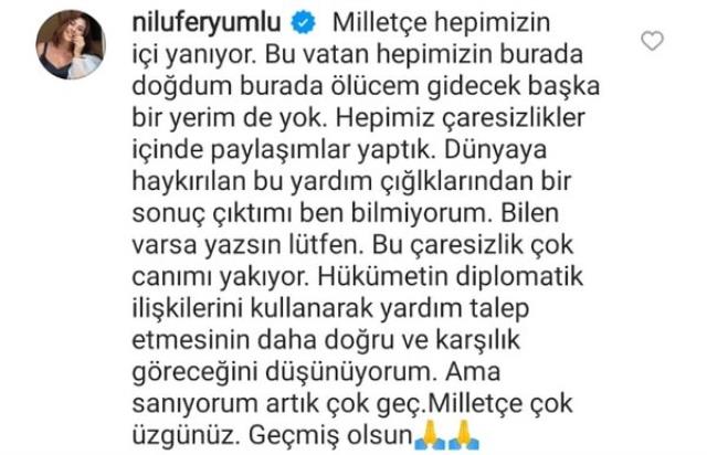“Milletçe hepimizin içi yanıyor. Bu vatan hepimizin burada doğdum burada öleceğim gidecek başka bir yerim de yok. Hepimiz çaresizlikler içinde paylaşımlar yaptı. Dünyaya haykırılan bu yardım çığlıklarından bir sonuç çıktı mı, ben bilmiyorum. Bilen varsa yazsın lütfen. Bu çaresizlik çok canımı yakıyor. Hükümetin diplomatik ilişkilerini kullanarak yardım talep etmesinin daha doğru ve karşılık göreceğini düşünüyorum. Ama sanıyorum artık çok geç. Milletçe çok üzgünüz. Geçmiş olsun.” ifadelerine yer verdi.