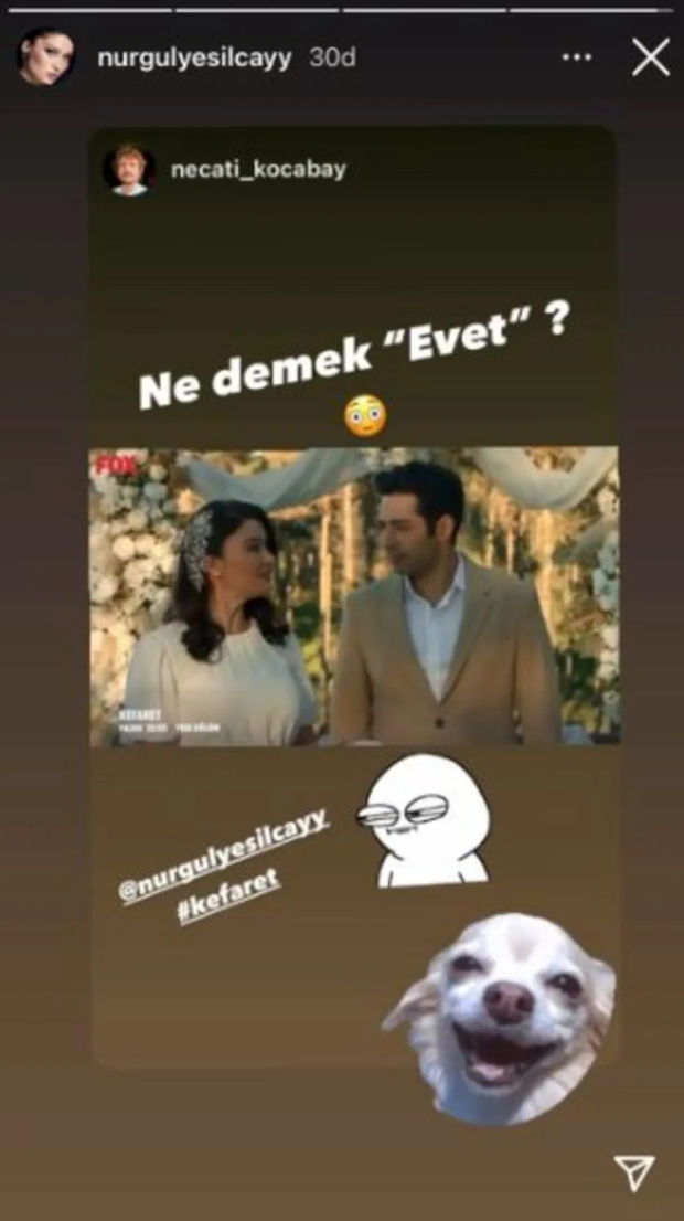 Dizideki nikahta evliliğe ‘evet’ diyen Yeşilçay’ı etiketleyen Kocabay, “Ne demek evet?” notuyla sevgilisine gönderme yapıyor. Nurgül Yeşilçay da bu esprili durumu kendi Instagram sayfasına taşıdı…