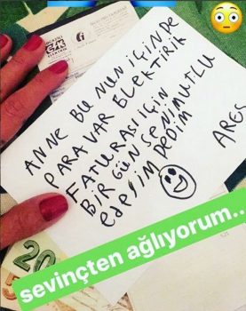 “Elektrik, su, doğalgaz faturalarımız posta kutumuza geldiğinde çocuklara birlikte alıyoruz. Bugün onlar benden önce almışlar. Eve geldiğimde odamda, yatağımın ucunda bu zarf vardı… Yaz sonu toplantı yapmıştık hepimiz. Bütçelerimizi belirledik. Kışa bir tatil daha yapabilmemiz için elektriklerimizi kapatmamız gerektiğini, suyumuzu boşa harcamamız gerektiğini, yemeklerimizi, giyeceklerimizi özenle kullanmamız gerektiğini konuşmuştuk. Okullar başlayacağı için yeni çanta, ayakkabı, forma, okul kitapları, defter, kalem kutusu gibi ihtiyaçlarını alırken geçen sene kullandıklarını her sene olduğu gibi ihtiyacı olan çocuklara göndermek üzere birlikte koliledik ve içine el yazımızla “güle güle kullanın” yazdık. Şu an sizlere bu satırları yazarken ağlıyorum… ‘Anne evimize tek başına bakıyor bunu unutmayın’ demiştim onlara. Anne ekrana çıkınca, konsere gidince para kazanıyor ve biz öyle evimize, buzdolabımıza, üstümüze, yeni şeyler, oyunlar alabiliyoruz diye anlatmıştım. Bazı arkadaşlarında gördükleri ve bizde neden olmadığını sordukları şeyler de vardı. Onların da bizde olamayışının sebeplerini gözlerinin içine bakarak izah etmiştim. Oğlum bu ay biriktirdiği bayram harçlıklarından evimizin elektrik faturasını beyaz bir zarfa not yazarak ödüyor… Yaşı 8″