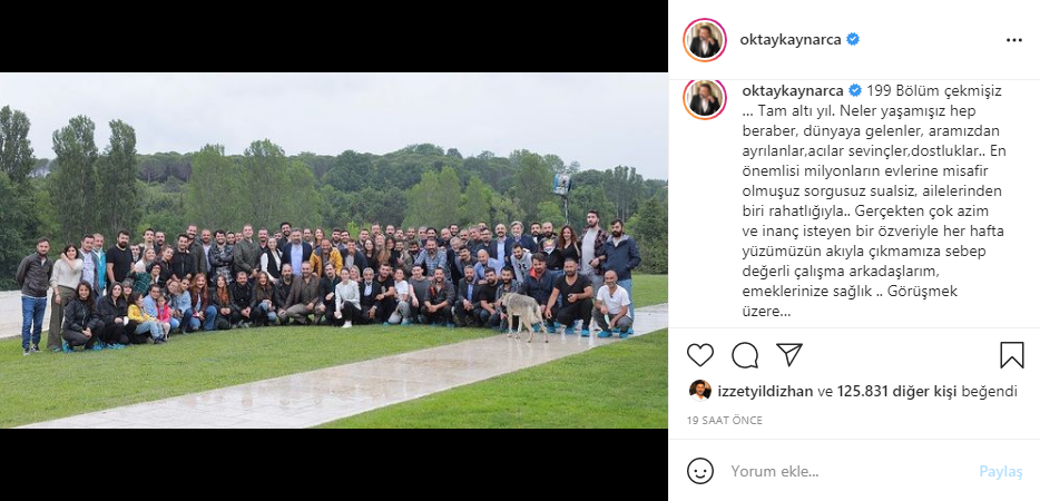 Kaynarca, sezon finali öncesinde 1,7 milyon takipçisinin bulunduğu Instagram hesabından yaptığı veda paylaşımında, “199 bölüm çekmişiz. Tam altı yıl. Neler yaşamışız hep beraber. Dünyaya gelenler, aramızdan ayrılanlar, acılar, sevinçler, dostluklar. En önemlisi milyonların evlerine misafir olmuşuz sorgusuz sualsiz, ailelerinden biri rahatlığıyla. Gerçekten çok azim ve inanç isteyen bir özveriyle her hafta yüzümüzün akıyla çıkmamıza sebep değerli çalışma arkadaşlarım, emeklerinize sağlık. Görüşmek üzere” ifadelerini kullandı.