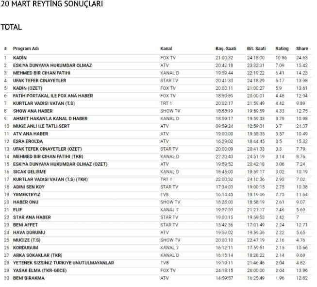 Reytinglere bakınca gördüm ki; hiç de öyle onların kesin birinci çıkar dedikleri gibi gelmemiş sonuçlar…