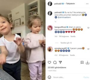Sosyal medyayı aktif kullanan isimlerden olan Pelin Akil, Alin ve Lina’nın sevimli bir videosunu takipçileri ile paylaştı. Pelin Akil, ikizlerinin konuştuğu videoyu “Bu ne bu? Ne anlatıyorlar sizce altta yorumlar bekliyorum” notunu ekledi. Ünlü oyuncunun paylaşımı kısa sürede binlerce beğeni ve yorum aldı.
