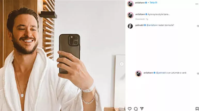 Pelin Akil, paylaşıma, ”Neden bornozla?” yorumunu yaptı. Anıl Altan da eşine ”Çünkü o an üstümde o vardı” yanıtını vermişti.