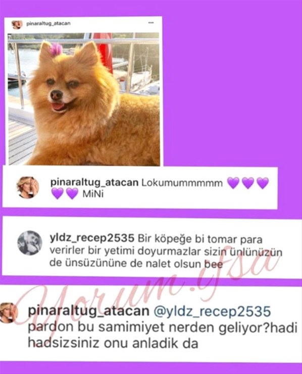 Pınar Altuğ’ın kısa sürece binlerce beğeni alan paylaşımına, bir takipçisi “Bir köpeğe bir tomar para verirler bir yetimi doyurmazlar. Sizin ünlünüzü de ünsüzünüze de lanet olsun bee.” yorumunu yazdı.