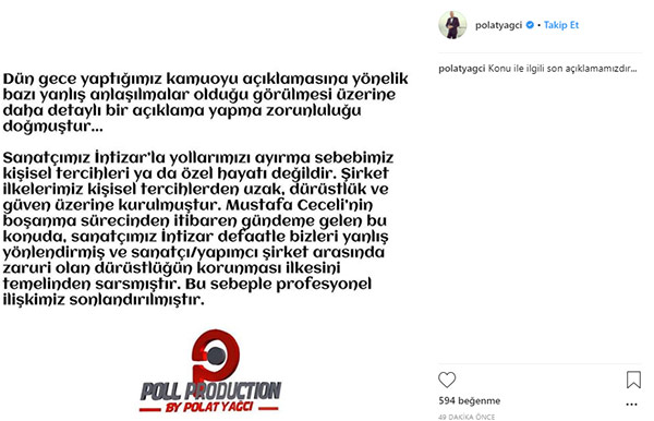 İntizar’ın bağlı olduğu yapım şirketinin sahibi Polat Yağcı, sosyal medyadan açıklama yaparak, ünlü şarkıcıyla bağlarını kopardığını açıklamıştı:: Yaklaşık iki yıldır Poll Production çatısı altında sanatsal faaliyetlerini sürdüren İntizar’ın medya vasıtasıyla kamuoyuna yansıyan haberlerini üzüntü ve şaşkınlıkla okuduk. Kendisinin bugün itibariyle şirketimizle hiçbir bağı kalmamıştır. Saygılarımızla.” açıklamasını yapmıştı.