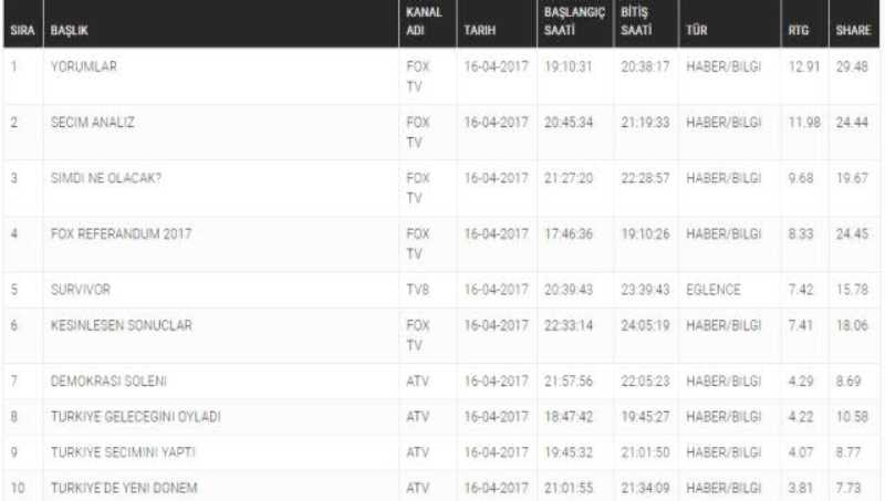 Anayasa Referandumu sonrası yapılacak olan yayınlar büyük önem taşıyordu ve ekranlarda tercih edilme sebeplerinden biri de tarafsız olmalarıydı. Her seçimde kıyasıya yaşanan oy açıklama ve yüzde verme savaşı bu kez biraz duruldu. Çünkü Aandolu Ajansı’nın verdiği veriler tüm kanallar tarafından kullanılınca istatistikler de bilgiler de hemen hemen aynı anda yayınlandı. Burada ön plana çıkan ise programlardaki konuklardı. Ertuğrul Özkök’ün yer aldğı Fatih Portakal & İsmail Küçükkaya referandum gecesi programıyla FOX TV bu hafta zirveye oturdu. Ana haber bültenleriyle günlere damgasını vuran FOX TV, bu kez açık ara birinci oldu.