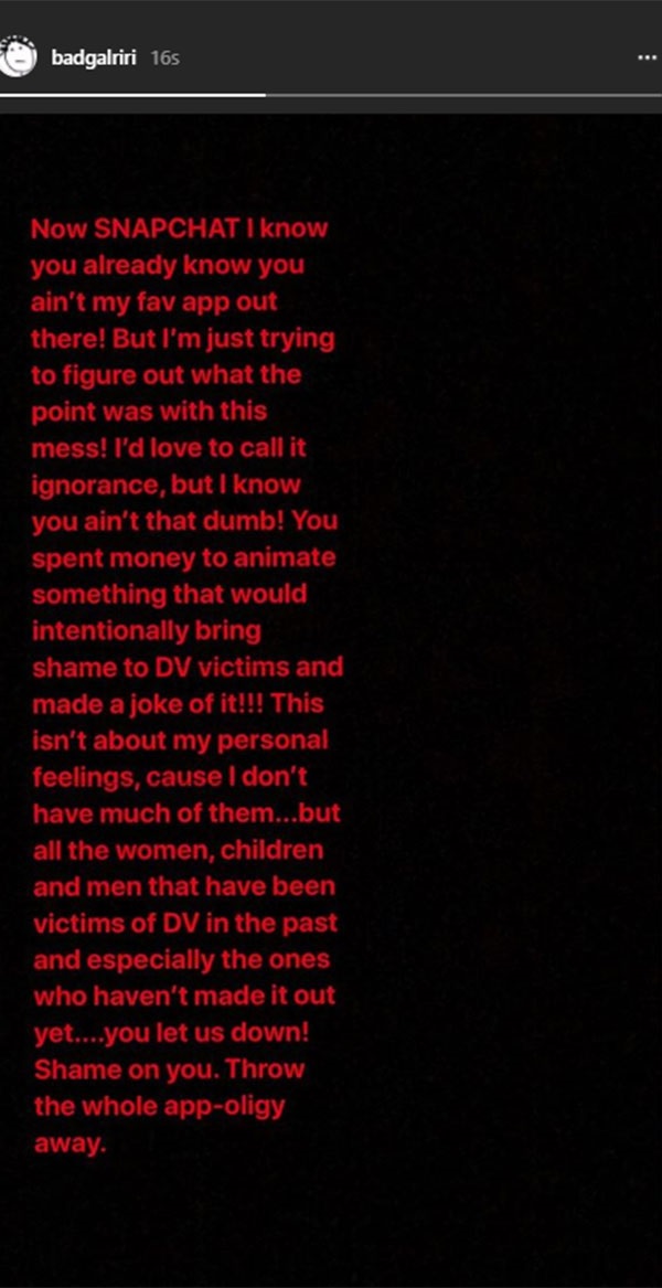 Rihanna, sosyal medya hesabından yaptığı “Buna seve seve ‘cahillik’ demek isterdim, ama o kadar aptal olmadığınızı biliyorum! Aile içi şiddet mağdurlarını utandırmak ve bu olguyla dalga geçmek için para harcadınız. Tepkim, kişisel hislerimle alakalı değil, çünkü bundan utanmıyorum. Ancak siz; beni, aile içi şiddet mağduru tüm kadınları, çocukları ve erkekleri ortaya atarak, bizi aşağıladınız. Kendinizden utanın.” şeklindeki paylaşımı ile tepkisini dile getirdi.