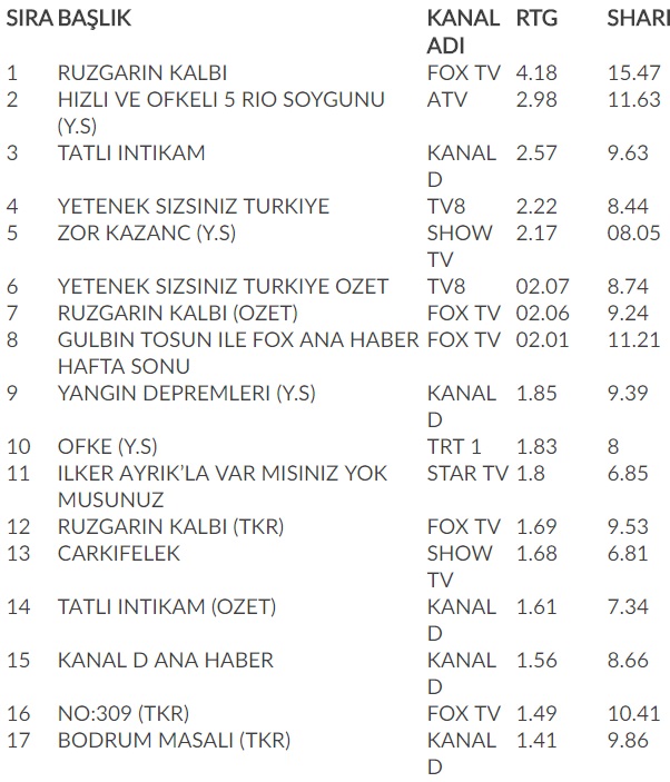 Yeni dizi Rüzgarın Kalbi, reyting listelerini alt üst etmeyi başardı. Rüzgarın Kalbi isimli yeni dizi, yayınlandığı 3 Eylül akşamı reyting listesinde zirveye yerleşti. Detaylar haberimizde… 3 Eylül akşamının reyting sonuçları açıklandı. Sonuçlara göre; Rüzgarın Kalbi isimli yeni dizi 3 Eylül Cumartesi gecesinin zirvesini kimseye kaptırmadı. Televizyon ekranlarına iddialı bir giriş yapan Rüzgarın Kalbi, izleyicinin beğenisini kazanmayı başardı. Listenin ilk sırasında yerleşerek birinciliği kimseye kaptırmayan Rüzgarın Kalbi dizisini, Hızlı ve Öfkeli Rio filmi ikinci sırada izledi. Üçüncü sırada Tatlı İntikam, Yetenek Sizsiniz dördüncü sırada, Zor Kazanç beşinci sırada yer aldı. Bunların yanı sıra, reyting listesinde sırası ile ilk 10’a sırasıya girenler Yetenek Sizsiniz Özet, Rüzgarın Kalbi Özet, Fox Ana Haber, Yangın Depremleri ve Öfke oldu. reyting