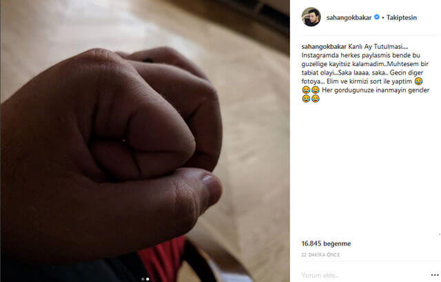 Paylaştığı fotoğrafın ardından ikinci kareye geçiş yapan tüm takipçiler büyük bir sürpriz ile karşılaştı. Eli ile yaptığı şekli yakın çekim ile kanlı ay gibi gösteren Şahan Gökbakar, herkesi güldürdü. “Kanlı Ay Tutulmasi…. Instagramda herkes paylasmis bende bu guzellige kayitsiz kalamadim..Muhtesem bir tabiat olayi…Saka laaaa, saka.. Gecin diger fotoya… Elim ve kirmizi sort ile yaptim. Her gordugunuze inanmayin gencler’ diyerek yaptığı paylaşımın altında bir not da düşen ünlü komedyenin paylaştığı fotoğraflar ise şöyle;