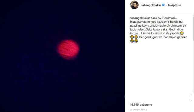 Dün akşam yaşanan Kanlı Ay tüm dünyanın yakından takip ettiği bir olay olurken Şahan Gökbakar paylaştığı fotoğraflarla Kanlı Ay’ı görmek isteyenleri trolledi. İşte o mesaj ve fotoğraflar.