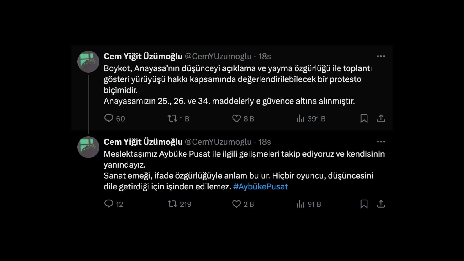 Boykota destek veren sanatçılar üzerindeki baskı giderek artıyor. Aybüke Pusat‘ın TRT’nin Teşkilat dizisinden çıkarılmasının ardından, sevgilisi Furkan Andıç ve meslektaşı Boran Kuzum da projelerinden ayrılmak zorunda kaldı.