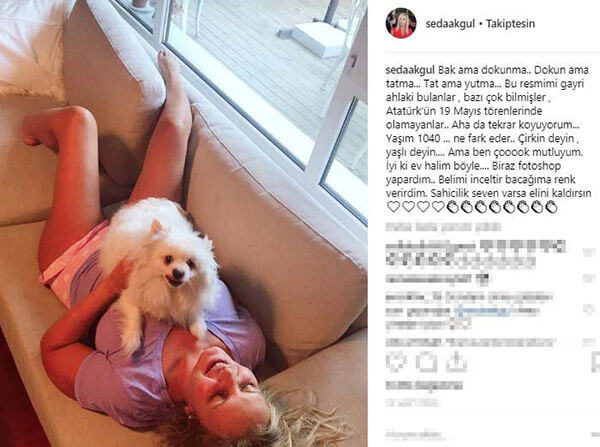 Sosyal medyada köpeğiyle çekilen fotoğrafını eleştirenlere yanıt veren ünlü sunucu Seda Akgül, “Aha da tekrar koyuyorum. Yaşım 1040, ne fark eder. ‘Çirkin’ deyin, ‘yaşlı’ deyin. Ama ben çok mutluyum. İyi ki ev halim böyle. Biraz photoshop yapardım. Belimi inceltir, bacağıma renk verirdim. Sahicilik seven varsa elini kaldırsın” ifadelerini kullandı.
