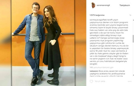 Kendisine sert sözler ile göndermede bulunduğunu iddia ettiği Esra Erol’a zehir zemberek sözler ile eleştiride bulunan Seren Serengil, programdaki partneri Cengiz Semercioğlu ile birlikte çekilmiş bir fotoğrafını sosyal medya üzerinden paylaşarak uzunca bir mesaj ekledi.