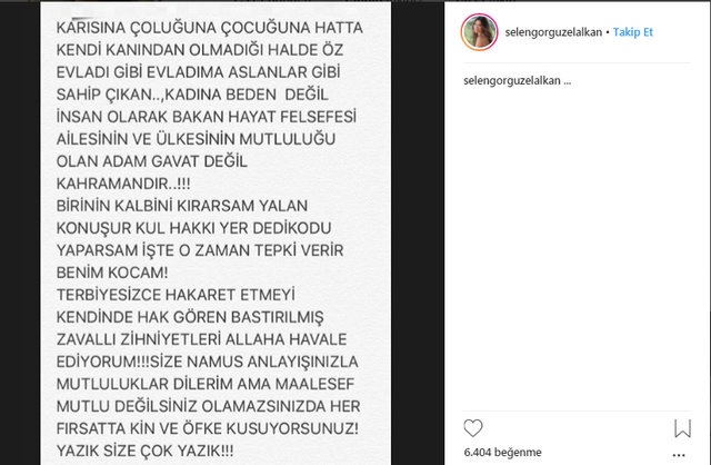 Karısına çoluğuna çocuğuna hatta kendi kanından olmadığı halde öz evladı gibi evladıma aslanlar gibi sahip çıkan, kadına beden değil insan olarak bakan hayat felsefesi ailesinin ve ülkesinin mutluluğu olan adam, gavat değil kahramandır! Birinin kalbini kırarsam yalan konuşur kul hakkı yer, dedikodu yaparsam, işte o zaman tepki verir benim kocam. Terbiyesizce hakaret etmeyi kendince hak gören bastırılmış zavallı zihniyetleri Allah’a havale ediyorum. Size namus anlayışınızla mutluluklar dilerim ama maalesef mutlu değilsiniz olamazsınız da. Her fırsatta kin ve öfke, kusuyorsunuz. Yazık size çok yazık!