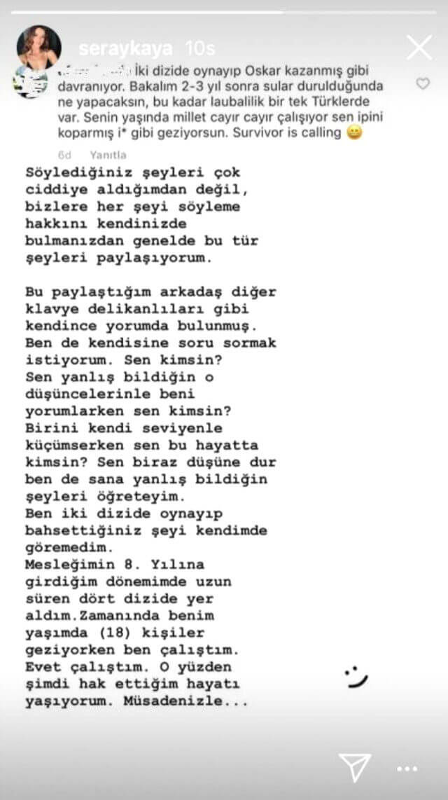 Takipçisinin mesajını hikaye bölümünden yayınlayan Seray Kaya, isyan etti. Seray Kaya, “Söylediğiniz şeyleri çok ciddiye aldığımdan değil, bizlere her şeyi söyleme hakkını kendinizde bulmanızdan genelde bu tür şeyleri paylaşıyorum. Bu paylaştığım arkadaş, diğer klavye delikanlıları gibi kendince yorumda bulunmuş. Ben de kendisine sormak istiyorum. Sen kimsin? Sen yanlış bildiğin o düşüncelerinle beni yorumlarken sen kimsin?” diyerek tepki gösterdi…