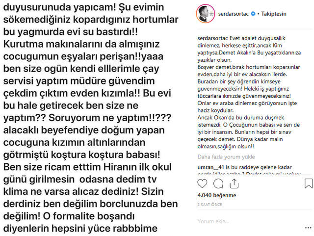 Okan Kurt ile 10 dakikada boşanan Demet Akalın haczedilen evinin fotoğrafını paylaşarak, ‘Kopardığınız hortumlar yüzünden evimi su bastı’ diyerek isyan etmişti. Serdar Ortaç’dan Demet Akalın’a destek mesajı geldi. Ünlü şarkıcı Serdar Ortaç, ‘Evet adalet duygusallık dinlemez, herkese eşittir,ancak Kim yaptıysa,Demet Akalın’a Bu yaşattıklarınıza yazıklar olsun. Boşver demet, bırak hortumları koparsınlar evden,daha iyi bir ev alacaksın ilerde. Buradan bir şey öğrendin kimseye güvenmeyeceksin! Heleki iş yaptığınız tüccarlara ikinizde güvenmeyeceksiniz! Onlar ev araba dinlemez görüyorsun işte haciz koydular. Ancak Okan’da bu duruma düşmek istemezdi. O Çocuğunun babası ve sen de iyi bir insansın. Bunların hepsi bir sınav geçecek demet. Dünya kadar malın olmasın,sağlığın olsun!’ notunu yazdı…