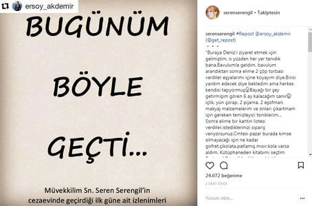 Fotoğraf Serengil’in hesabından: “Sero’muzdan haber var… Sero Avukatı Ersoy bey aracılığı ile bize ilk günün iyi geçtiği ve iyi olduğu ile ilgili mesaj iletti…. ve sevgilerini yolladı… ” açıklaması yapılarak paylaşıldı.