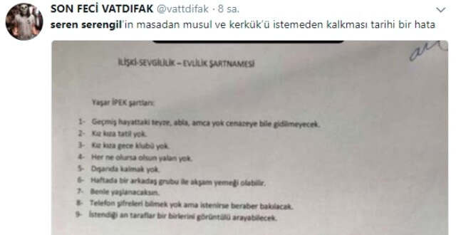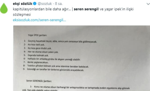 Seren Serengil ve Yaşar İpek’in imzaladığı barışma sözleşmesi, sosyal medyanın diline düştü. Sosyal medya kullanıcılarının konu hakkında yaptığı paylaşımlardan bazıları şu şekilde:
