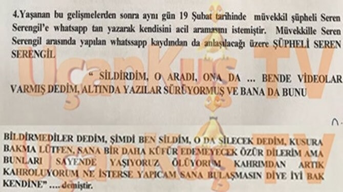 Belgeye göre Seren Serengil eski sevgilisi Özay Bakır’a yazdığı iddia edilen ifadeler şu şekilde: SİLDİRDİM. O ARADI ONA DA… BENDE VİDEOLAR VARMIŞ DEDİM, ALTINDA YAZILAR SÜRÜYORMUŞ VE BANA DA BUNU BİLDİRMEDİLER DEDİM, ŞİMDİ BEN SİLDİM, O DA SİLECEK DEDİM, KUSURA BAKMA LÜTFEN, SANA BİR DAHA KÜFÜR EDEMEYECEK ÖZÜR DİLERİM AMA BUNLARI SAYENDE YAŞIYORUZ. ÖLÜYORUM KAHRIMDAN, ARTIK KAHROLUYORUM NE İSTERSE YAPICAM SANA BULAŞMASIN DİYE İYİ BAK KENDİNE…