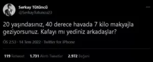 Son olarak Twitter hesabı üzerinden paylaşım yapan Serkay Tütüncü, birçok takipçisinin dikkatini çekti. Twitter’dan paylaştığı mesajla dikkatleri üzerine çeken Serkay Tütüncü, “20 yaşındasınız, 40 derece havada 7 kilo makyajla geziyorsunuz. Kafayı mı yediniz arkadaşlar?” sözleriyle olay oldu.