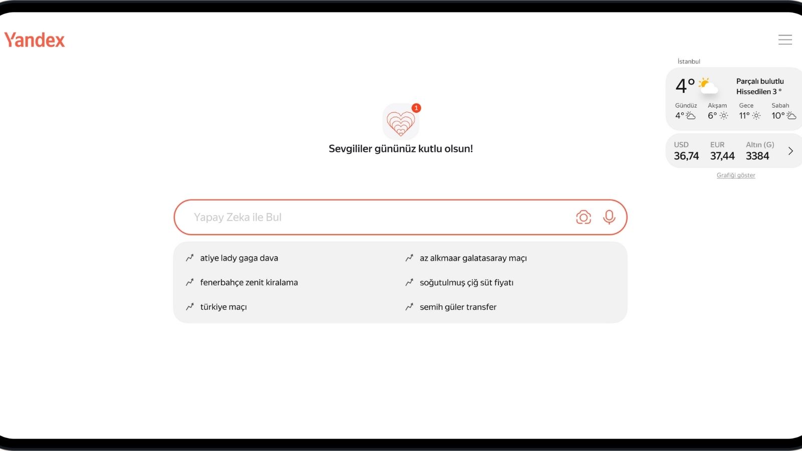 Yapay zeka destekli arama motoru Yazeka, kullanıcıların Sevgililer Günü için ihtiyaç duyduğu tüm bilgileri tek bir çatı altında sunuyor. Hediyelerden etkinliklere kadar her konuda arama yapanlar, Yandex Arama ve Yandex Tarayıcı uygulamalarıyla ihtiyaç duydukları bilgilere kolayca ulaşabiliyor.