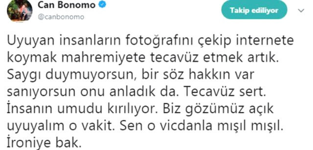 Sosyal medya hesabından isyan eden Can Bonomo, gizli gizli fotoğraflarının çekilip paylaşılması ile ilgili yaptığı paylaşımda “Uyuyan insanların fotoğrafını çekip internete koymak mahremiyete tecavüz etmek artık. Saygı duymuyorsun, bir söz hakkın var sanıyorsun onu anladık da. Tecavüz sert. İnsanın umudu kırılıyor. Biz gözümüz açık uyuyalım o vakit. Sen o vicdanla mışıl mışıl. İroniye bak.” dedi.