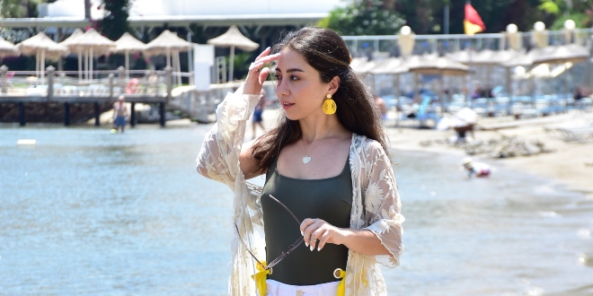 Güzel şarkıcı, önceki gün Bodrum Bardakçı Koyu’ndaki Azka Otel Beach’de görüntülendi. Güneşlenmek yerine denize girmeyi tercih eden güzel şarkıcı kendisini Ege’nin soğuk sularına bıraktı. Şarkıcının mayo ve küpe uyumu gözlerden kaçmadı..