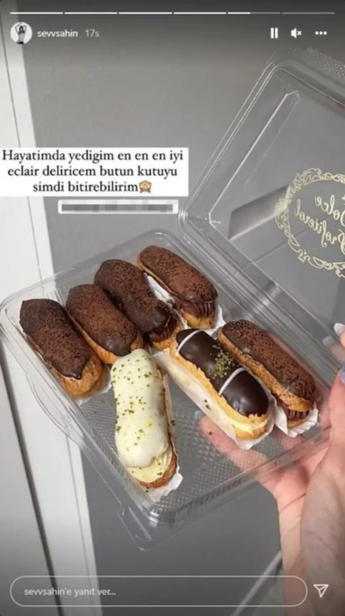 Şevval Şahin yaptığı bu paylaşıma, “Hayatımda yediğim en en en iyi eclair delireceğim bütün kutuyu şimdi bitirebilirim” notunu düştü. Şahin’in eklere “eclair” demesi sosyal medyada gündem oldu.