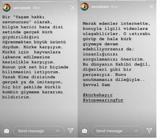Şevval Sam, bilgisi haricinde dizide kendisine gerçek kürk giydirildiğini öğrendiğini ve kürke karşı olduğunu belirterek hayranlarına söyledi…