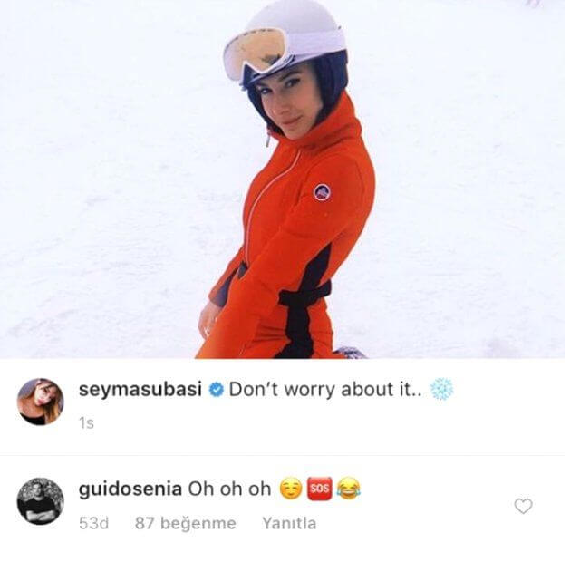 Kayak tatilinden bir anını paylaşan Şeyma Subaşı’ya aşk yaşadığı Guido Senia’dan yorumu dikkat çekiciydi. Fransız DJ Şeyma Subaşı’nın fotoğrafına, “Oh oh oh” yorumunda bulundu. Sosyal Medya Fenomeni Şeyma Subaşı’nın bir takipçisi fotoğrafa, “O enişteye Türkçe öğretmişsin helal olsun.” yorumunda bulundu. Başka bir takipçisi ise, “Miami’den Kartalkaya’ya” yorumu ile dikkat çekti…