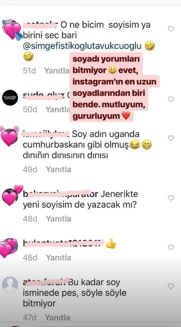Evlendikten sonra kendi soyadının yanına bir de eşinin soy adını ekleyince biraz tuhaf görüntüler ortaya çıktı. Hal böyle olunca güzel spikeri takip eden sosyal medya kullanıcıları “o ne biçim bir soy isim ya” gibi yorumlarda bulundu. Simge Fıstıkoğlu’nun bu yorumlara cevabı ise, “soyadı yorumları bitmiyor evet, instagramın en uzun soyadlarından biri bende, mutluyum gururluyum” açıklamasını yaptı.