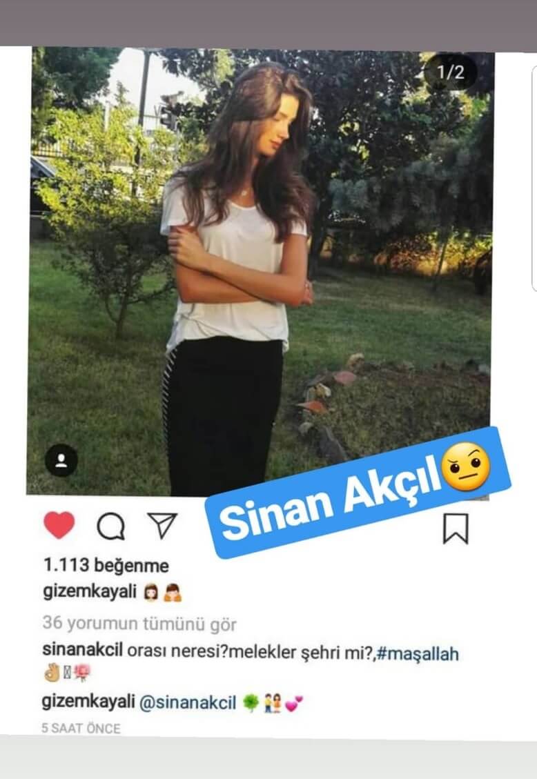 Son zamanlarda aşk hayatı ile gündeme gelen Sinan Akçıl, sosyal medya üzerinden geçtiğimiz günlerde aşk yaşamaya başladığı Gizem Kayalı’ya iltifat etti. Gizem Kayalı, sosyal medya platformu Instagram’daki hesabından bir fotoğrafını paylaştı. Fotoğrafı gören ünlü şarkıcı Sinan Akçıl, Kayalı’ya “Orası neresi? Melekler şehri mi? Maşallah.” şeklinde iltifat etti. Gizem Kayalı da, sevgilisi Sinan Akçıl’ın iltifatlarına kalp, çiçek ve el ele tutuşan bir erkek bir kadın emojileri eklediği bir yanıt verdi.