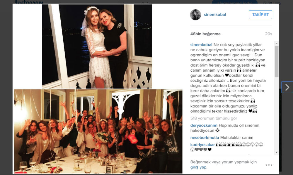 Gecenin sonunda Sinem Kobal, arkadaşları ile birlikte çekildiği fotoğrafı sosyal medya hesabından paylaşarak altına şu notu düştü: “Dostlar, kendi seçtiğimiz ailemizdir. Ben yeni bir hayata adım atarken bunun önemini bir kez daha anladım.”
