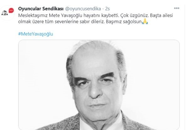 Oyuncular Sendikası Twitter hesabından yapılan son açıklamada, “Meslektaşımız Mete Yavaşoğlu hayatını kaybetti. Çok üzgünüz. Başta ailesi olmak üzere tüm sevenlerine sabır dileriz. Başımız sağolsun” ifadeleriyle yayımlandı..