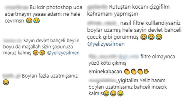 Yeliz Yeşilmen’in fotoğrafının altına “Sayın Devlet Bahçeli Bey’in boyu da sizin photoshoptan nasibini almış.’, ‘Bu kadar photoshopu abartmayın’ gibi yorumlar yapıldı.