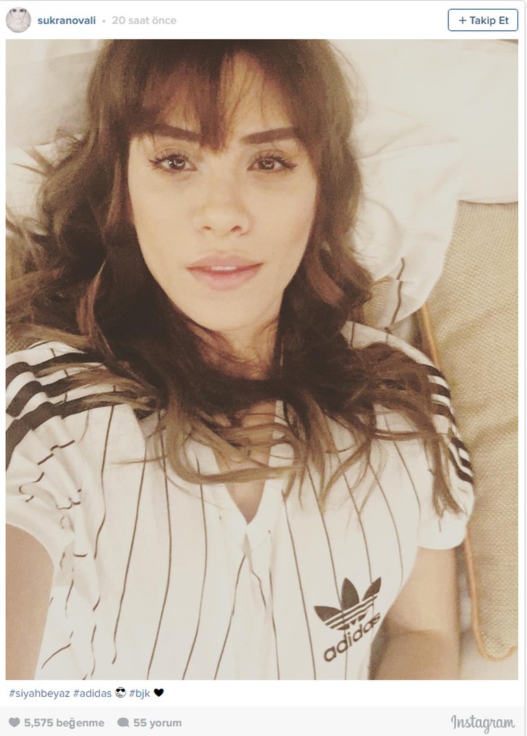 Instagram hesabından Beşiktaş formalı fotoğrafını paylaşırken, hashtag olarak da #siyahbeyaz #adidas #bjk yazan güzel oyuncu, Caner Erkin’i bir hayli kızdıracağa benziyor. Paramparça dizisinin yapımcısından “Aşk hayatınla kesinlikle gündeme gelmeyeceksin” uyarısı alan Şükran Ovalı’nın yaptığı Caner Erkin ile ilgili “İlişkimiz yok” açıklaması ünlü futbolcuyu sinirlendirmişti. Yaşadığı aşkı gizli tutmak isteyen Şükran Ovalı, Caner Erkin’in Instagram’dan takip isteğine karşılık vermemişti.