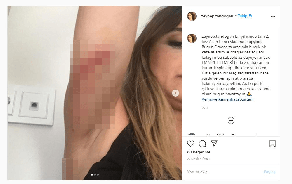 Tandoğan paylaşımına “Bir yıl içinde tam 2. kez Allah beni evladıma bağışladı. Bugün Dragos’ta aracımla büyük bir kaza atlattım. Airbagler patladı, sol kulağım bu sebeple az duyuyor ancak EMNİYET KEMERİ bir kez daha canımı kurtardı spin atıp direklere vururken. Hızla gelen bir araç sağ taraftan bana vurdu ve ben spin atıp araba hakimiyetini kaybettim. Araba perte çıktı yeni araba almam gerekecek ama olsun bugün hayattayım” ifadeleriyle duyurdu..