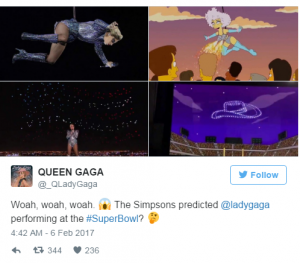 Birçok insanda Gaga ‘nın showunda havada süzülerek şarkı söylemesini ve dronlarla aydınlatma olayını ünlü çizgifilm The Simpsons’ın bir bölümünde ki konser sahnesine benzetti.